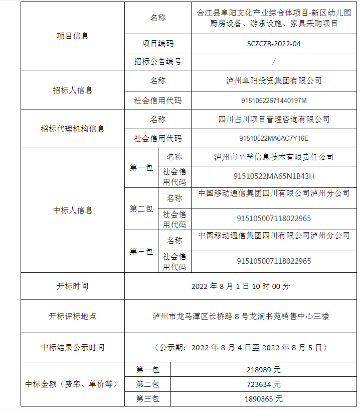 合江县bsports必一体育文化产业综合体项目-新区幼儿园厨房设备、游乐设施、家具采购项目公开招标中标结果公告
