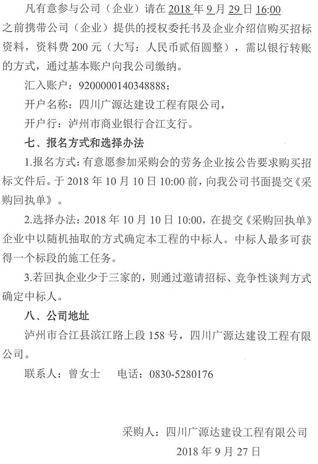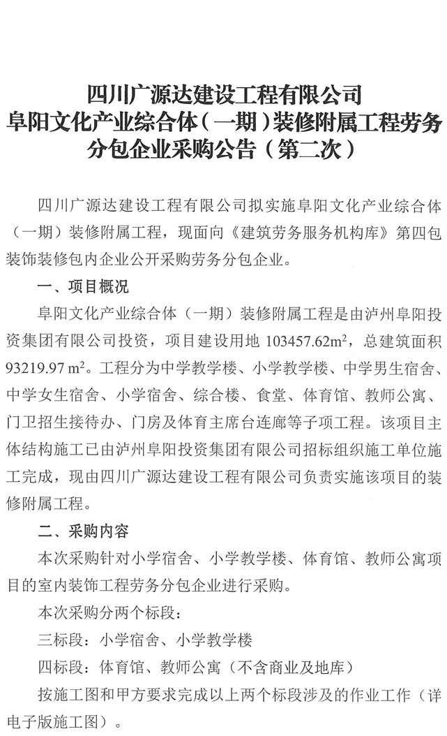 采购公告:四川广源达建设工程有限公司bsports必一体育文化产业综合体(一期)装修附属工程劳务分包企业采购公告(第二次)