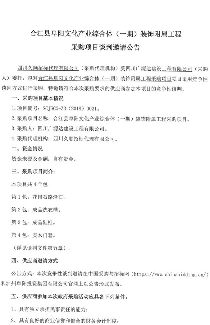 邀请公告:合江县bsports必一体育文化产业综合体(一期)装饰附属工程采购项目谈判邀请公告