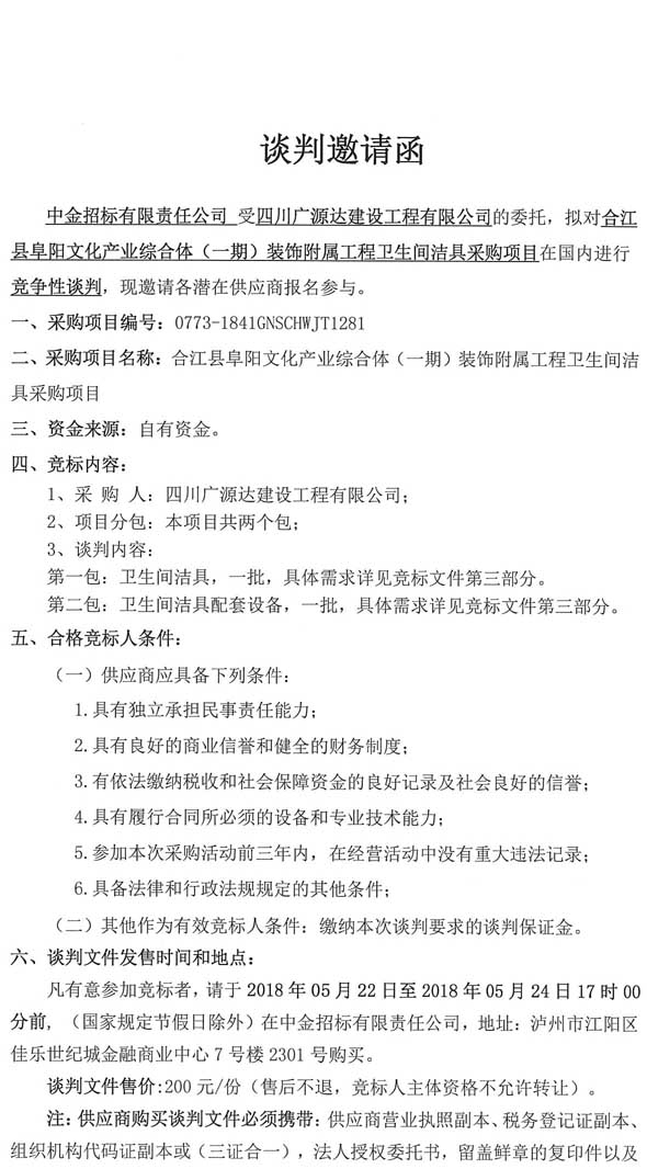 谈判邀请函:合江县bsports必一体育文化产业综合体(一期)装饰附属工程卫生间洁具采购项目