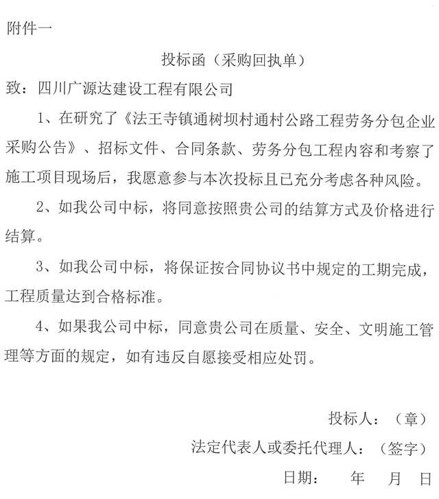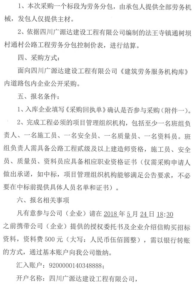 采购公告:四川广源达建设工程有限公司法王寺镇通树坝村通村公路工程劳务分包企业采购公告