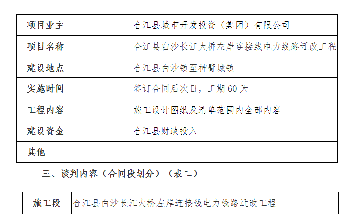 一、 本次谈判项目为合江县白沙长江大桥左岸连接线电力线路迁改工 程, 现通过竞争性谈判方式选择和确定承包人, 诚邀符合资格条件的 潜在申请人参与本项目的竞争性谈判。
