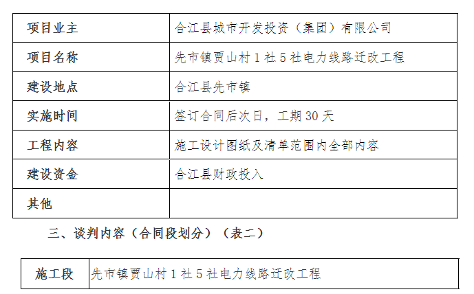 一、 本次谈判项目为先市镇贾山村 1 社 5 社电力线路迁改工程, 现通 过竞争性谈判方式选择和确定承包人, 诚邀符合资格条件的潜在申请 人参与本项目的竞争性谈判。
