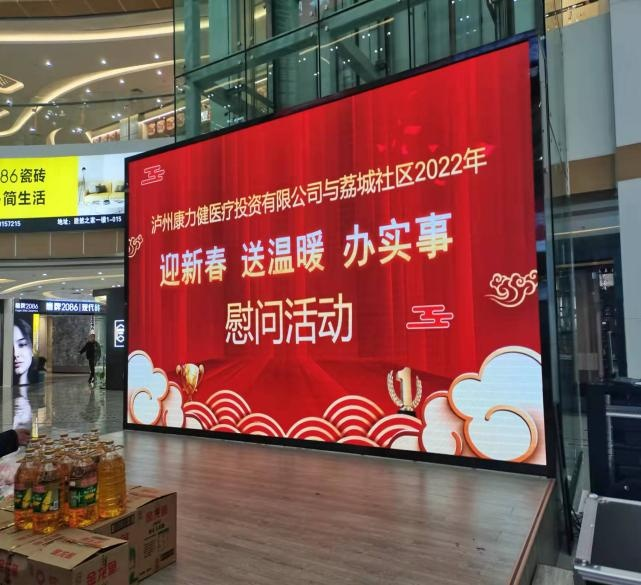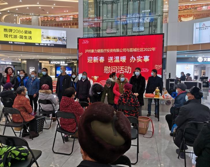 2022年1月25日,泸州康力健医疗投资有限公司携手荔城社区在中联万国商贸城举行“迎新春 送温暖 办实事”慰问活动。看望并慰问社区困难群众,并给他们带去了慰问物资及节日的问候与祝福,让他们感受到关怀和温暖。