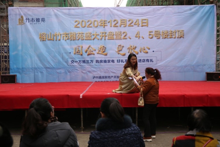 2020年12月24日上午,鑫晟地产公司在竹市雅苑售房部现场隆重举行项目开盘暨2、4、5号楼封顶活动。丰富多彩的节目表演、精彩有趣的有奖问答吸引了周边群众观看、参与。 此次活动达到了很好的宣传造势效果,使“国企造,更放心”深入人心。