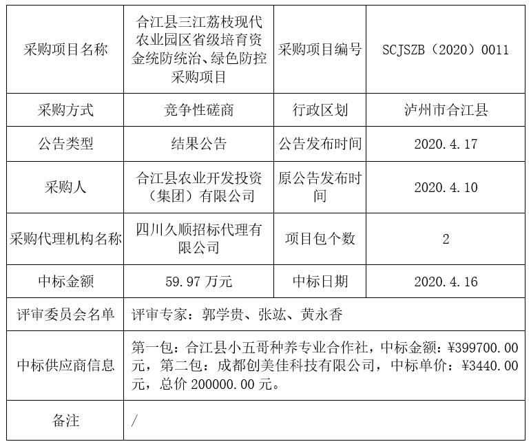 合江县三江荔枝现代农业园区省级培育资金统防统治、绿色防控采购项目竞争性磋商结果公告