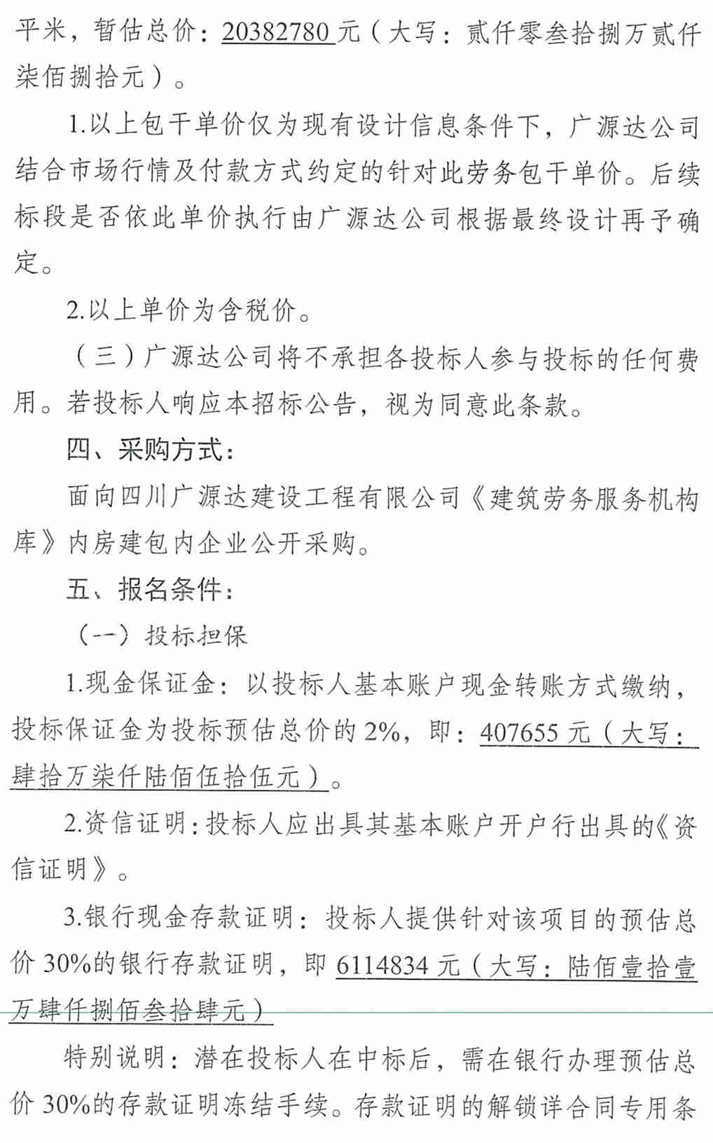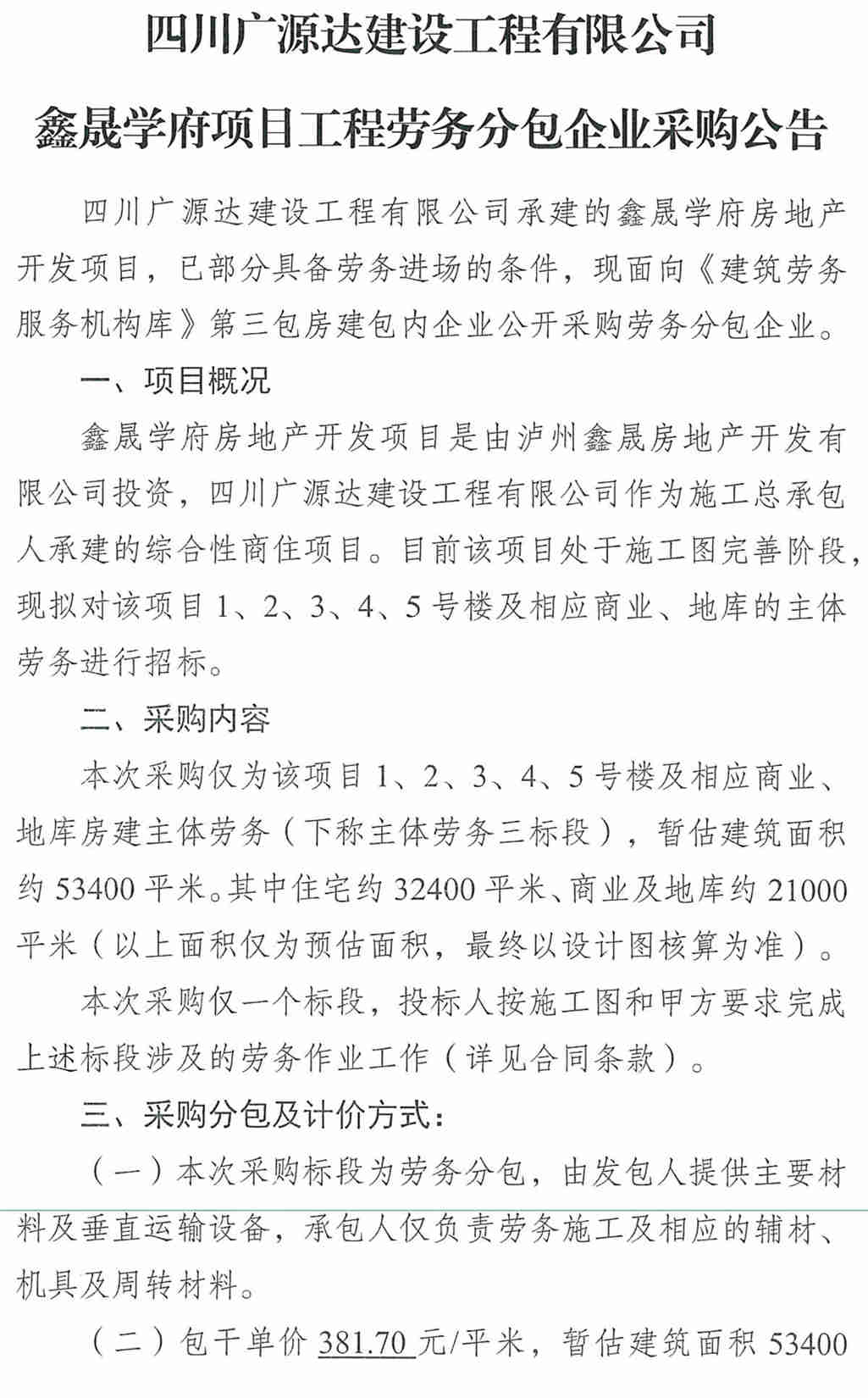 四川广源达建设工程有限公司鑫晟学府项目工程劳务分包企业采购公告
