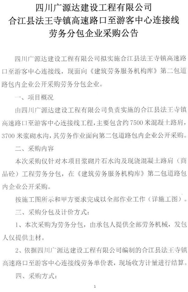 四川广源达建设工程有限公司合江县法王寺镇高速路口至游客中心连接线劳务分包企业采购公告