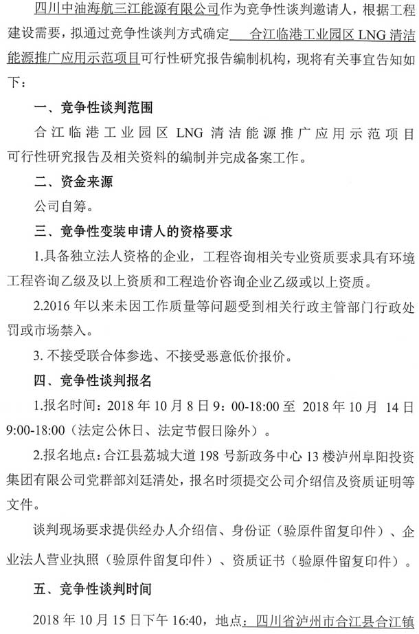 竞争性谈判公告:合江临港工业园区LNG清洁能源推广应用示范项目可行性研究报告编制单位竞争性谈判公告