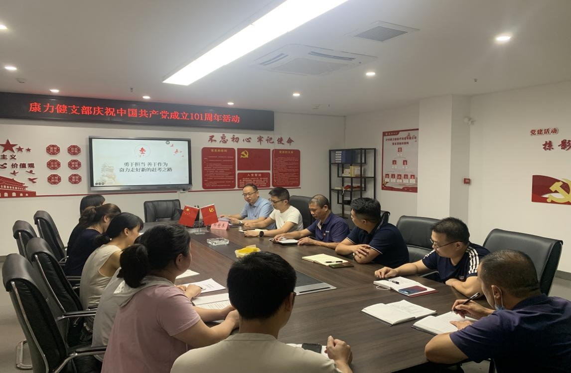 为庆祝中国共产党建党 101 周年, 7 月 1 日, 康力健党支部开展 “七一” 主题党日活动, 通过唱红歌、 重温入党誓词、 支部书记讲党 课等多种形式, 教育引导党员干部不忘初心, 知行合一, 以实际行动 迎接党的二十大胜利召开。