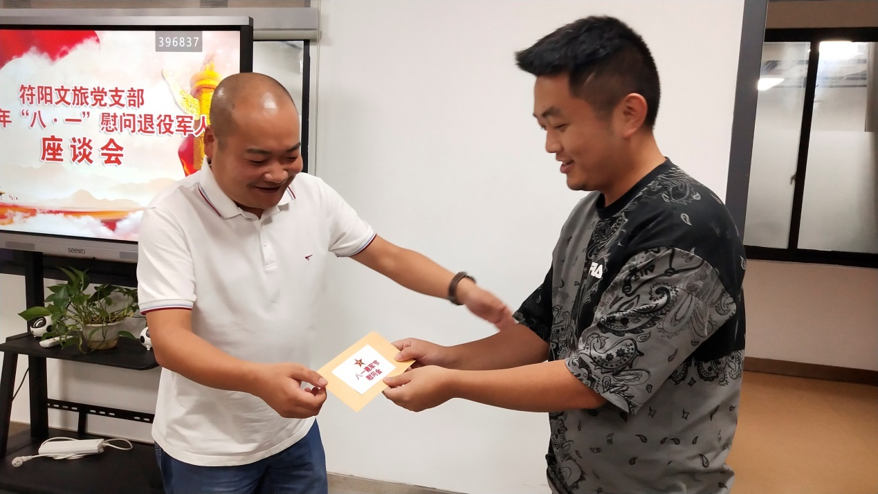 为扎实做好拥军优属 、 拥政爱民工作 , 在 “ 八 一 ” 建军节来临之际, 符阳文旅党支部开展 “ 八一 ” 慰问活动, 组织文旅 公司工作的退役军人召开座谈会, 了解他们的工作和生活情 况, 为他们送上慰问金, 并致以节日的祝福。 退役军人表示 感受到公司的关怀和爱心,在今后的工作中发挥军人本色, 为公司发展贡献力量。